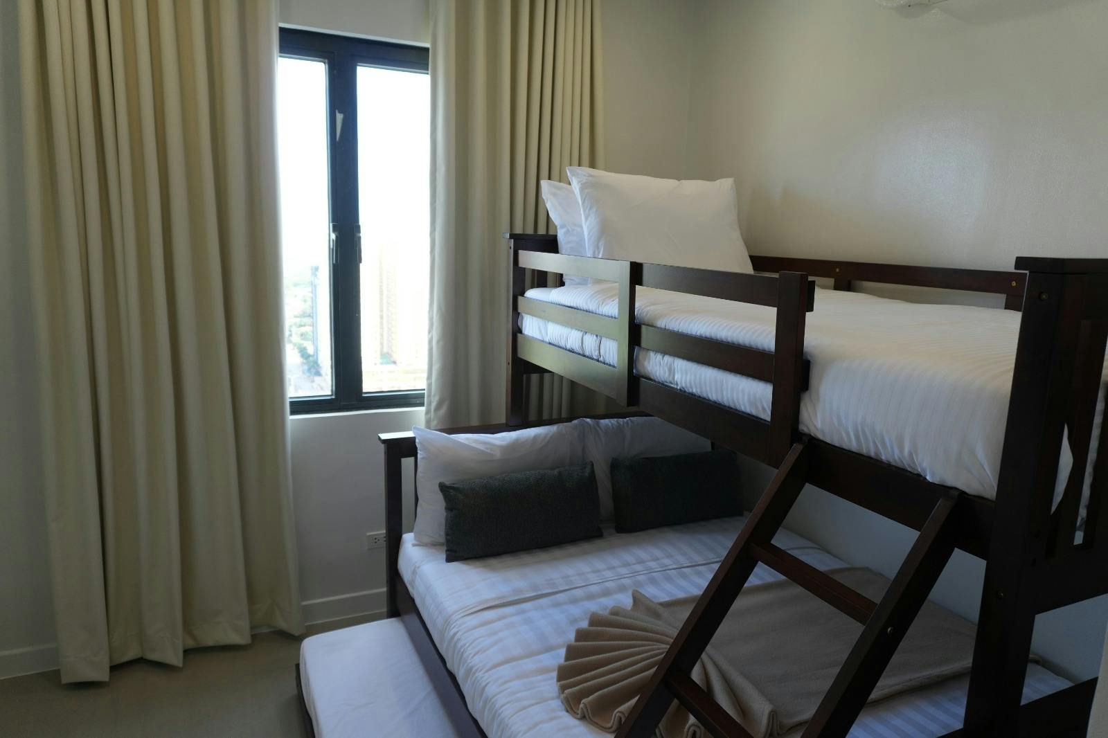A spacious 2-bedroom suite designed for families or groups, featuring bunk beds in both bedrooms (3 beds each) so everyone sleeps comfortably. Includes a large living/dining area, full bathroom(s), modern kitchenette, free Wi-Fi, and air-conditioning — ideal for get-togethers, reunions, or extended stays